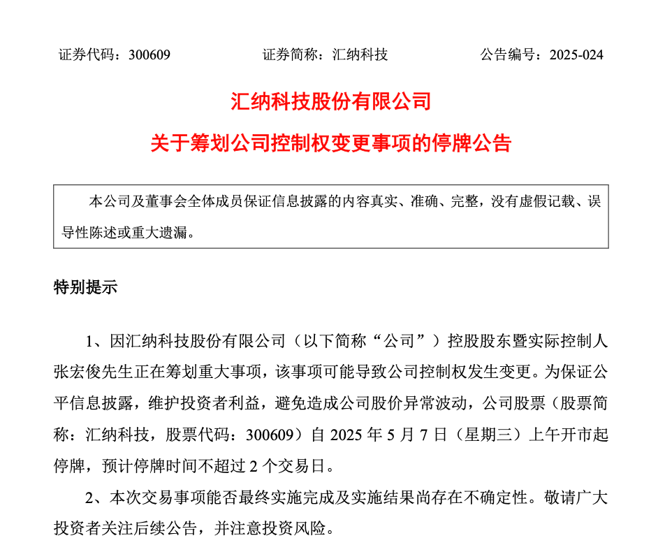 【导读】拟筹划控制权变更,汇纳科技明日停牌